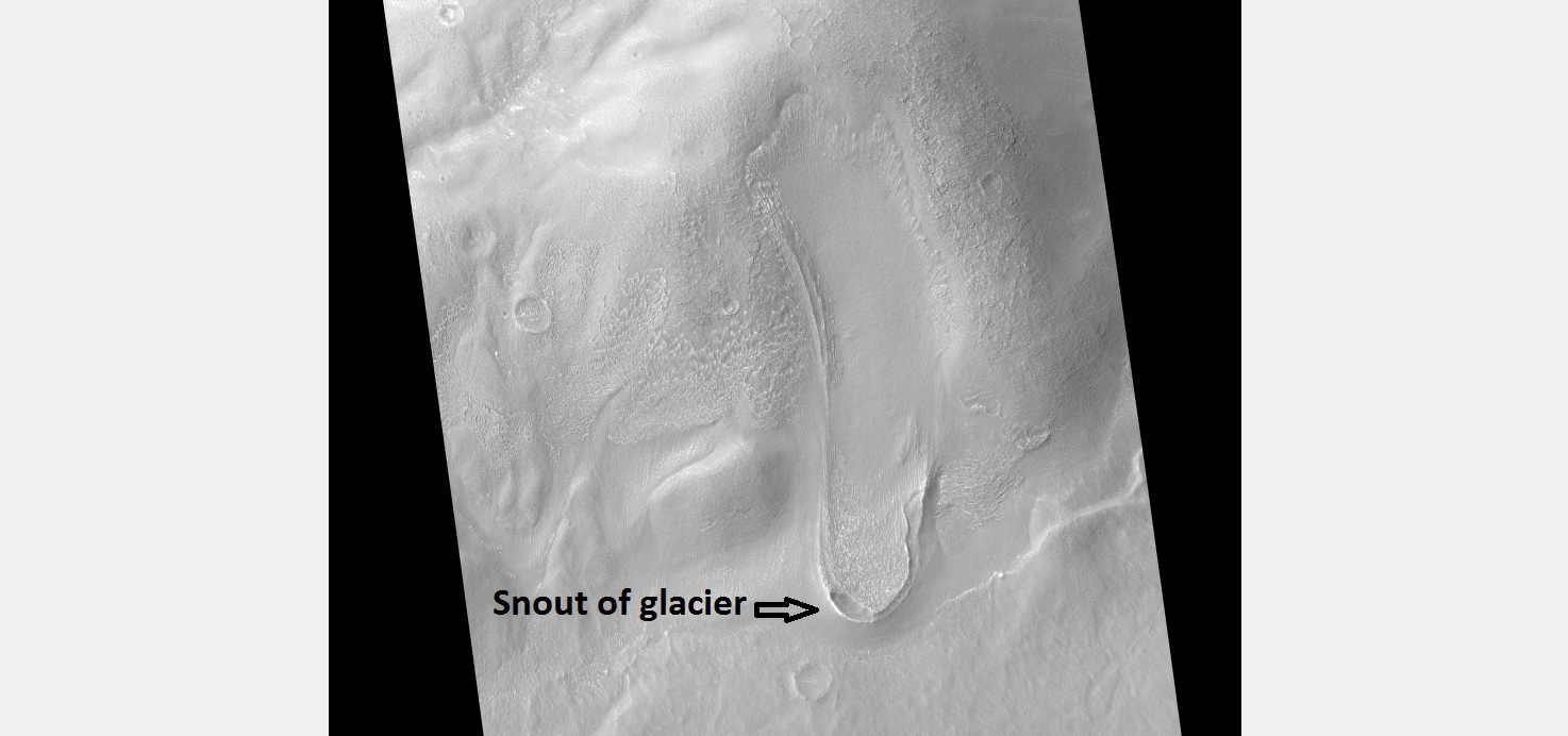 화성 정찰 위성(MRO) 우주선의 SHARAD 레이더 음향 측심기로 촬영한 레이더 이미지는 헬라스 평원 동부 지역의 3개 크레이터에 있는 엽상 잔해 둔덕이라는 지형이 흙과 암석 층 아래에 묻혀 있는 물 얼음 빙하임을 보여준다.[19] SHARAD로 측정한 이 크레이터 내 매몰된 얼음의 두께는 상부 크레이터에서 약 250m, 중간 및 하부 레벨에서는 각각 약 300m 및 450m이다. 과학자들은 눈과 얼음이 더 높은 지형에 축적되어 아래로 흘러내려갔고, 현재는 암석 잔해와 먼지 층에 의해 승화로부터 보호된다고 믿고 있다. 표면의 홈과 능선은 변형된 얼음에 의해 발생했다.헬라스 평원과 화성의 다른 지역의 많은 지형들은 표면이 움직였던 것처럼 보여 빙하를 강력하게 시사한다.
