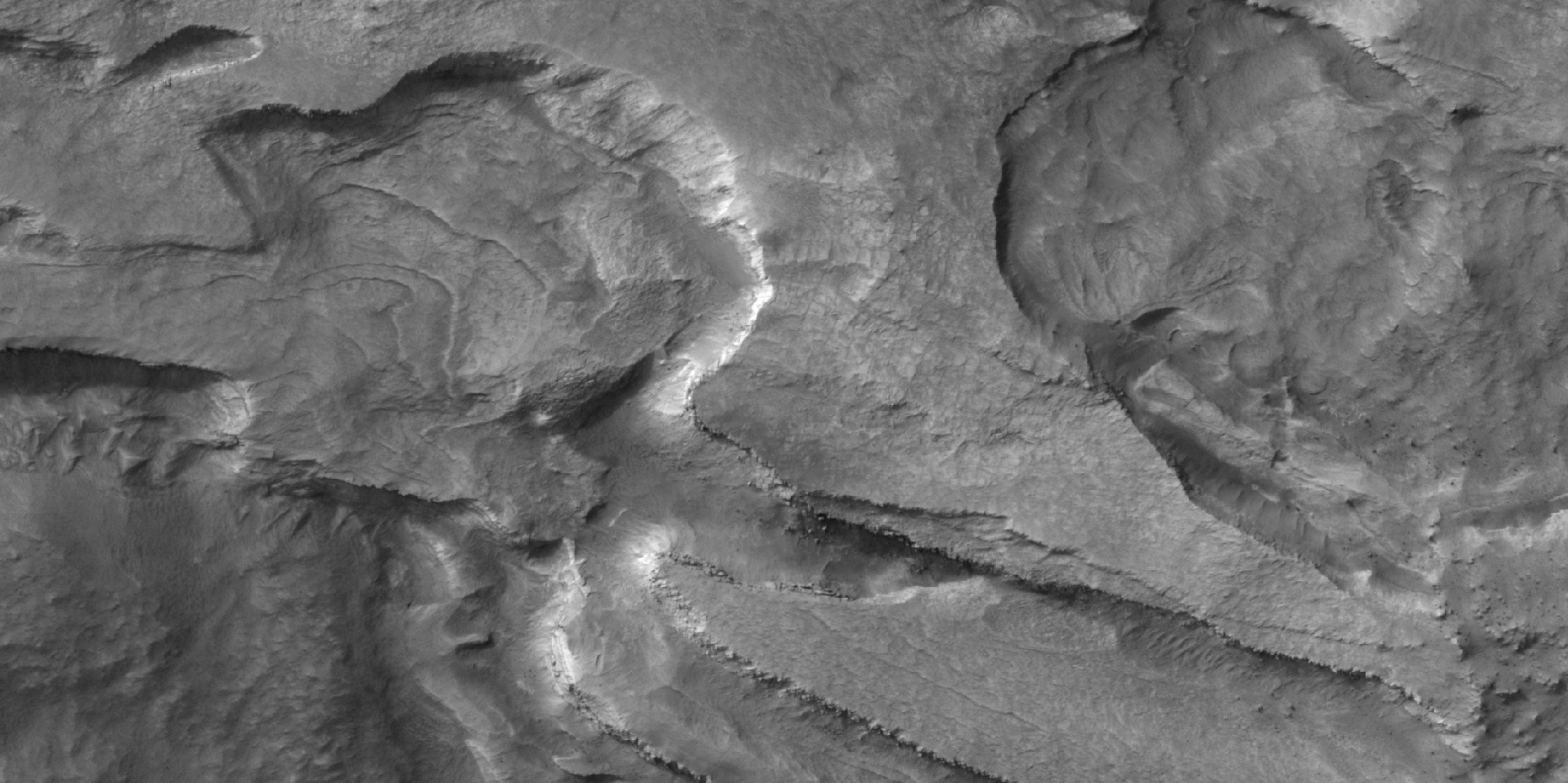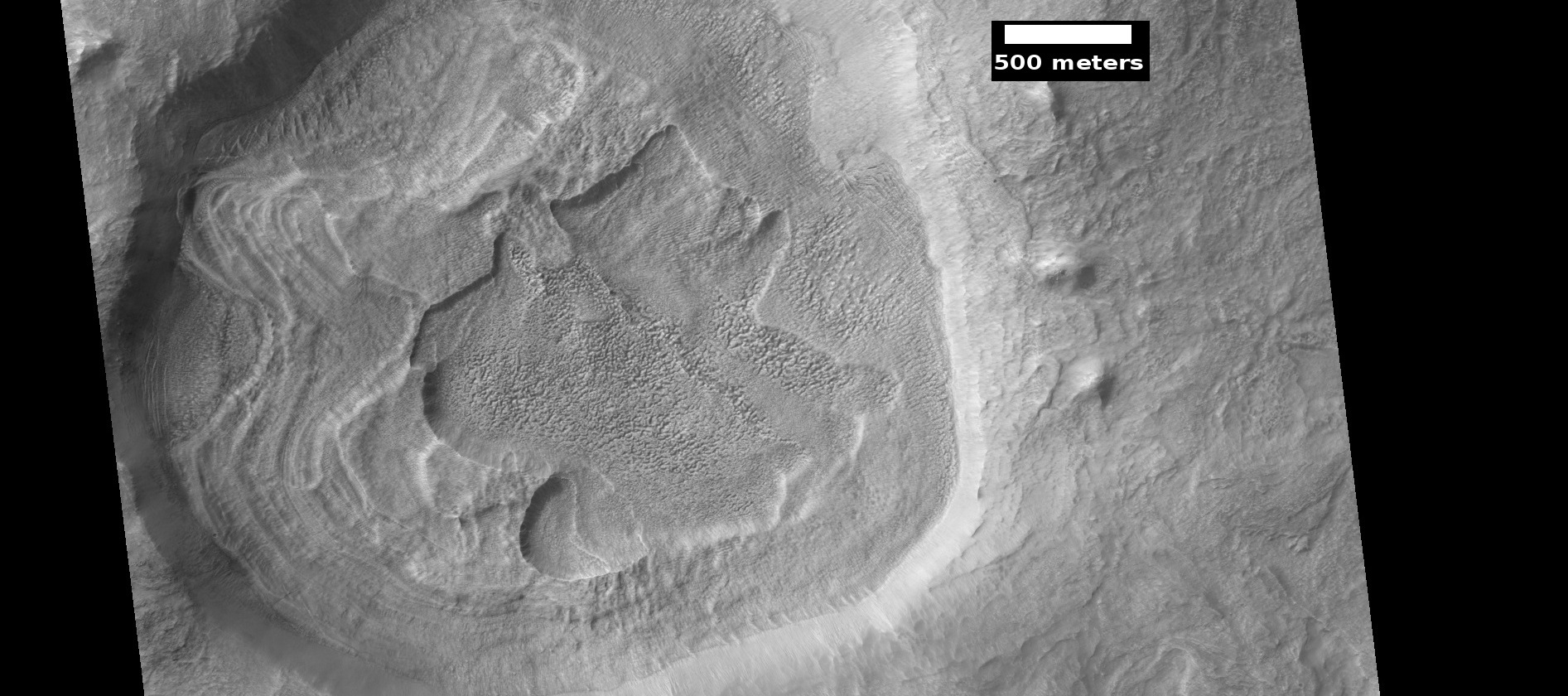 헬라스 평원 내 분화구에서는 여러 층상 구조가 발견되었다. HiRISE가 HiWish 프로그램을 통해 촬영한 이미지를 보면, 분화구 함몰 지형의 층들을 확인할 수 있다.[14] 횡사구 능선(TAR)이라고 불리는 특수한 형태의 모래 물결도 관찰된다.