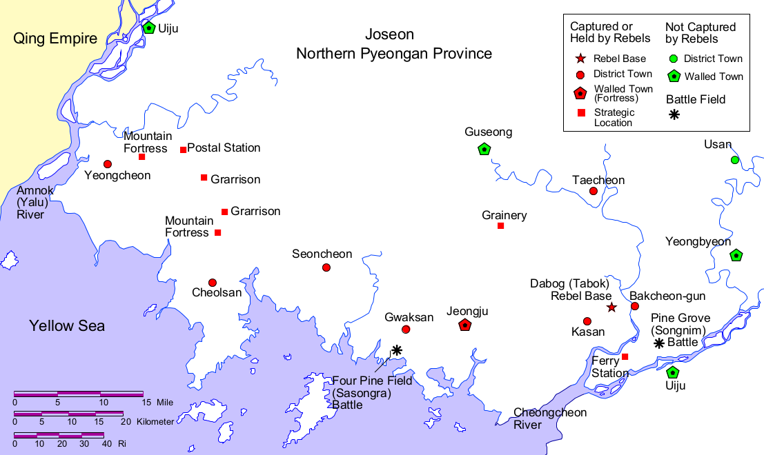 김사용(Kim)의 지휘 아래 두 반군의 연합군은 2월 4일 성천을 무혈 항복으로 점령했다. 그러나 구성의 성곽 도시는 반군에게 항복하지 않았다.