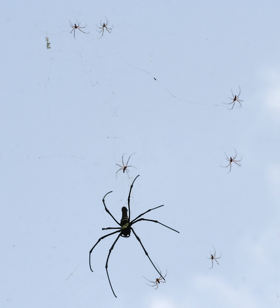 다른 거미와 마찬가지로, ''Nephila'' 속은 태양열을 줄이기 위해 체온 조절 행동을 보인다. 실험에 따르면, 온도가 32°C에 도달하면 몸과 들어오는 햇빛 사이의 각도를 조절하여 배를 태양 쪽으로 향하게 하지만 가슴 부위는 거미집과 평행하게 유지한다. 온도가 더 상승하면 햇빛 방향에 따라 몸 전체를 정렬하여 태양열을 받는 면적을 더욱 줄인다. 온도가 40°C 이상으로 올라가면 거미집을 버리기도 한다.