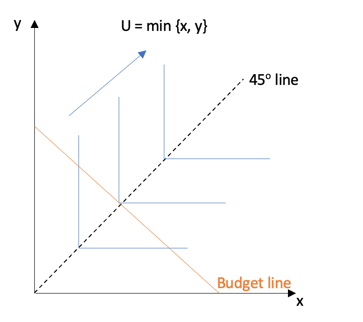 완전 보완재의 경우, 미분 불가능한 함수이므로 효용을 극대화하는 묶음을 찾기 위해 미분하는 단계를 수행할 수 없다. 따라서 직관을 사용해야 한다. 소비자는 x = y인 예산선과 교차하는 가장 높은 무차별 곡선의 굴절점에서 효용을 극대화한다.[3] 이는 소비자가 합리적이므로, 두 상품 중 한 상품을 더 많이 소비하고 다른 상품을 덜 소비할 이유가 없기 때문이다. 소비자는 두 상품 중 최소값에서 효용을 얻기 때문에, 한 상품만 더 소비하는 것은 효용을 증가시키지 않고 소득을 낭비하는 것이 된다.