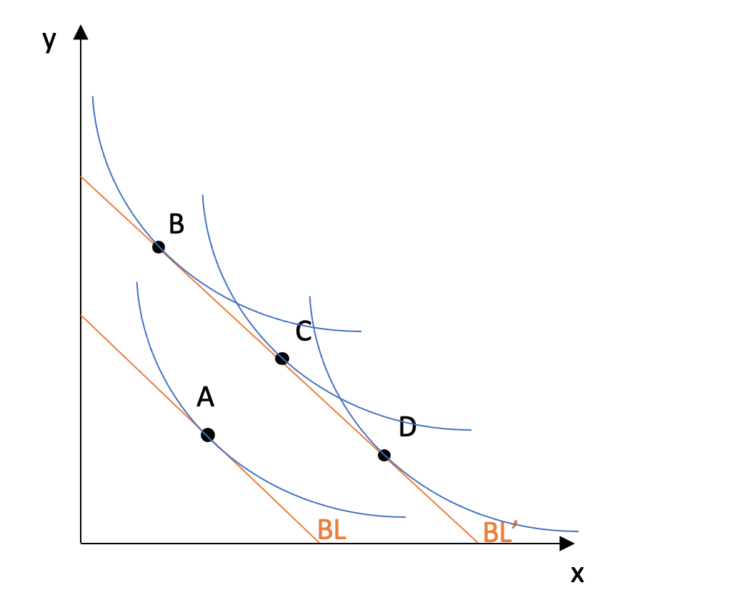 소비자의 소득이 증가하면 예산선이 바깥쪽으로 이동하고, 각 상품에 대한 선호도에 따라 상품 x, 상품 y 또는 둘 다에 더 많은 소득을 사용할 수 있게 된다. 상품 x와 y가 모두 정상재라면 두 상품의 소비는 증가하고 최적 묶음은 A에서 C로 이동한다. x 또는 y가 열등재라면 소득이 증가함에 따라 이에 대한 수요는 감소한다(최적 묶음은 B 또는 C 지점에 위치).[6]