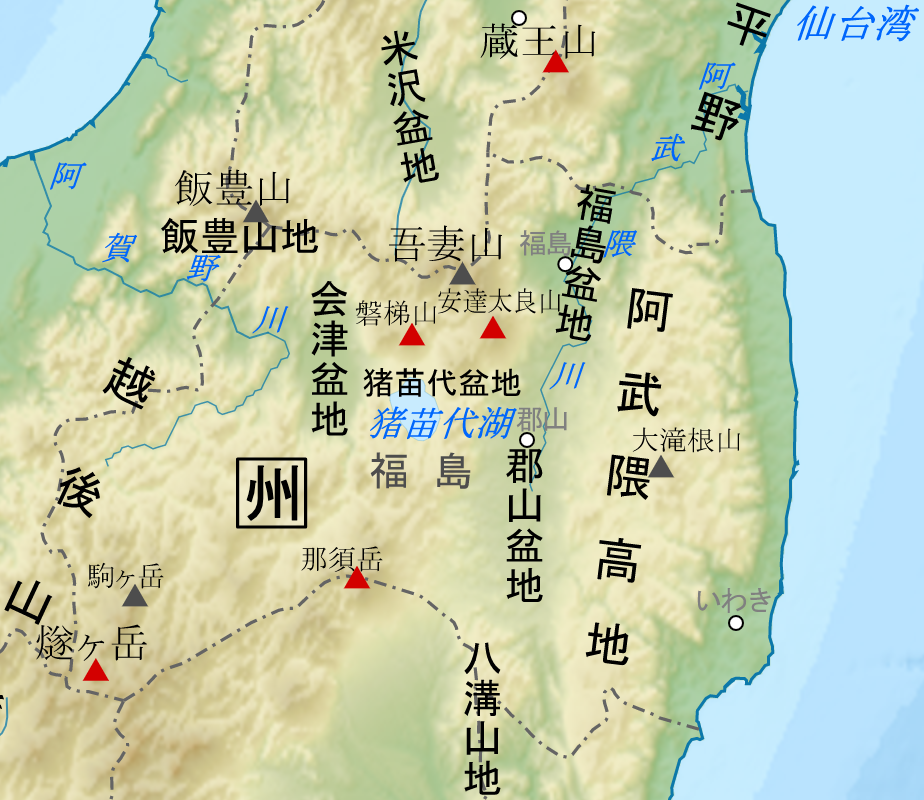 - 아이즈: 현 서부에 위치하며 에치고산맥과 오우산맥 사이의 내륙 지역이다. 면적의 약 40%를 차지하지만 인구는 약 13%에 불과하다. 겨울철에는 아이즈와카마쓰시를 중심으로 많은 눈(300~400cm)이 내린다.[85]
