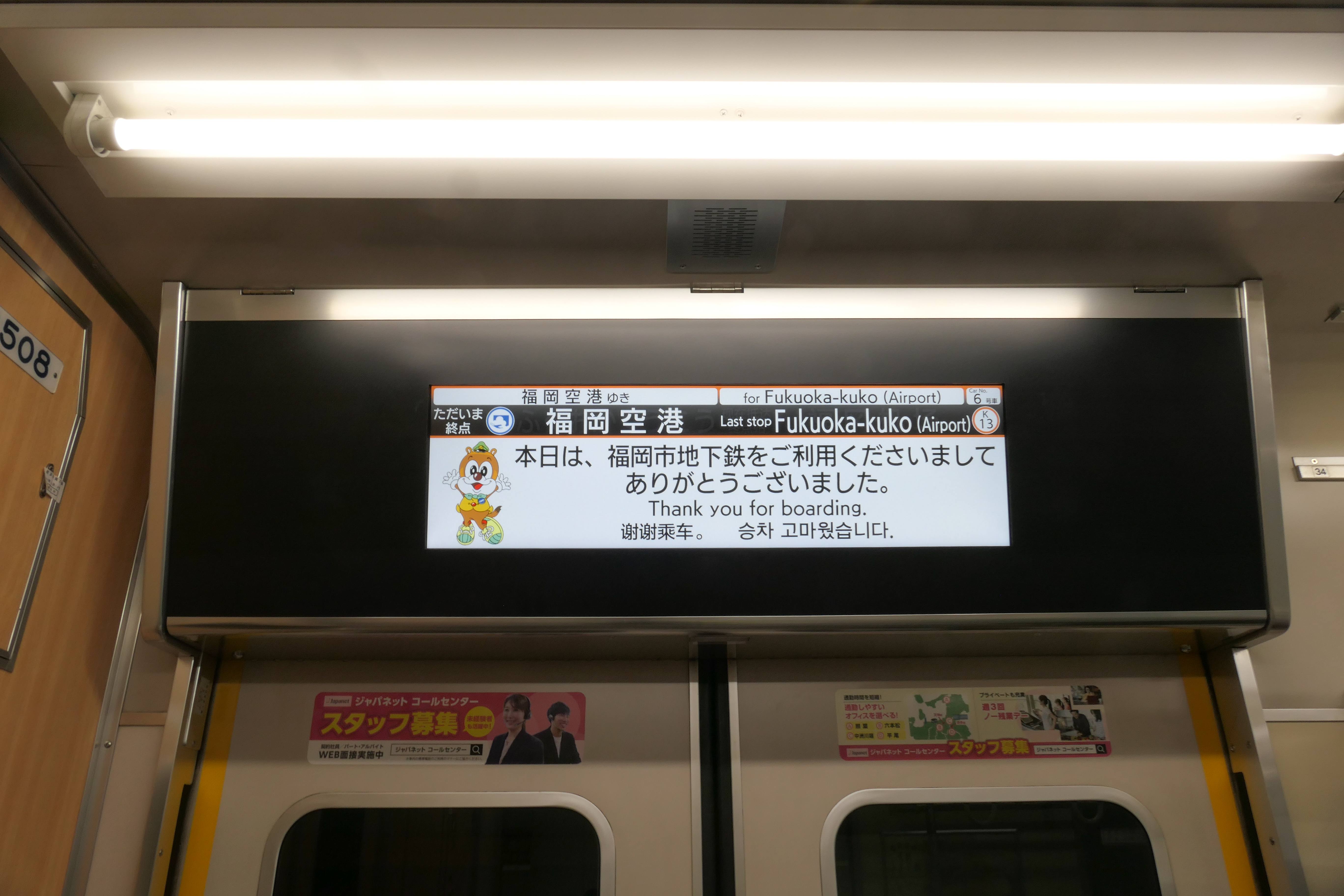 - 행선 표시기를 방향막이나 3색 LED 방식에서 일, 영, 중, 한 4개 국어 표시의 풀 컬러 LED로 교체했다. 표시 스타일은 막식과 유사하며, 역 번호도 함께 표기하고 있다. 차량 측면의 표시기에는 시발역에 한하여 후쿠오카 공항행의 경우 하단에 "텐진・하카타 방면으로 갑니다"라고, 가이즈카행의 경우에는 하단에 "하카타・후쿠오카 공항 방면으로는 가지 않습니다"라고 표시된다. 이 리뉴얼로 인해, 막식 표시기를 장착한 차량은 후쿠오카시 교통국에서 사라졌다.
